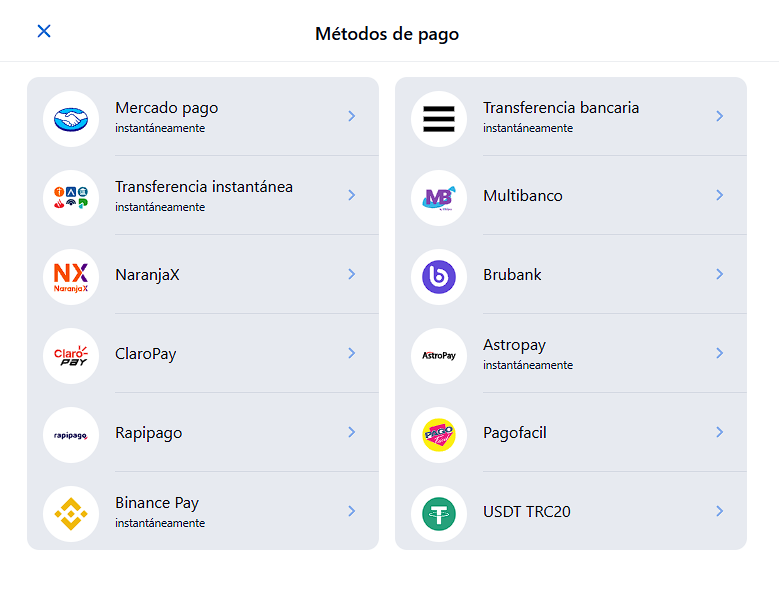 Depositá tu dinero sin intermediarios y en cualquier momento del día usando Mercado Pago, Transferencias o Astropay (método recomendado debido a que tiene mayores beneficios) También podes realizar depósitos y retiros usando Criptomonedas como USDT, BTC y ETH.